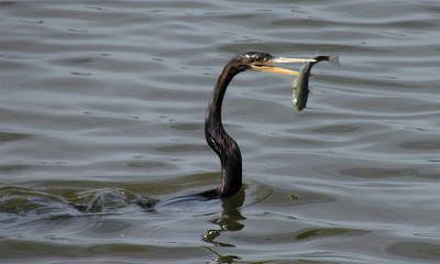 I’ve never seen Anhingas this close up before, so watching it hunt and feed at point-blank range was all the more exciting. Especially when the bird gets quite animated doing so – to prevent the fish’s dorsal spines from getting stuck in its throat, the Anhinga has to do a juggling act in order to swallow it, tossing the fish in the air until it points the right direction. As if the Anhingas didn’t look like they had a long enough neck already!